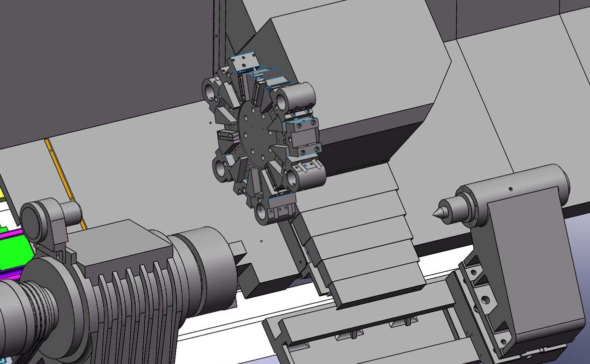12工位液壓刀塔設計,定位準確,換刀速度快。★45度斜床身結構